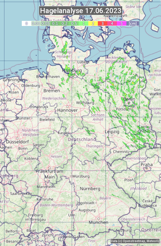 Die Hagelanalyse vom 17.06.2023 zeigt die Hagelspuren mit der maximalen Hagelkorngröße des Tages. Die Angabe erfolgt in Zentimeter.