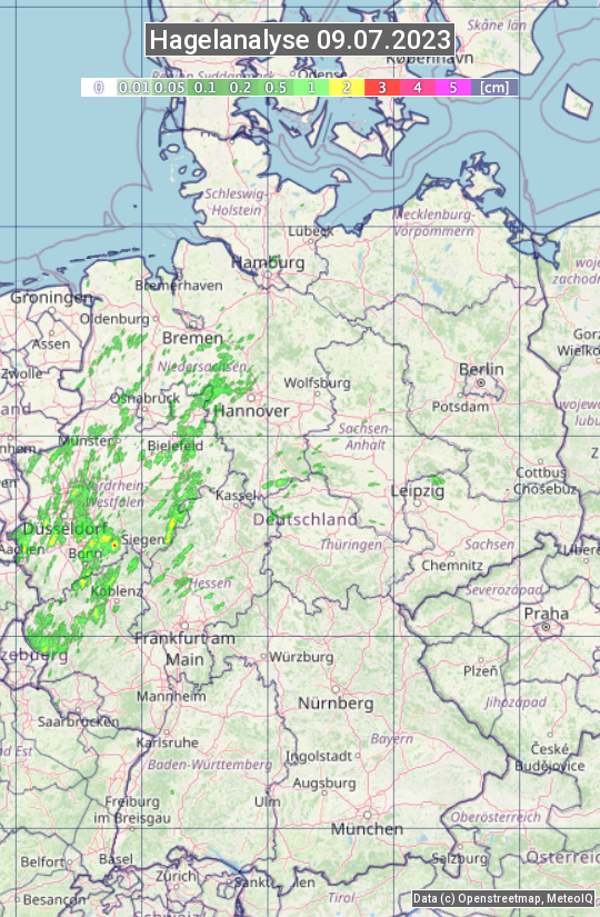 Die Hagelanalyse vom 09.07.2023 zeigt die Hagelspuren mit der maximalen Hagelkorngröße des Tages. Die Angabe erfolgt in Zentimeter.