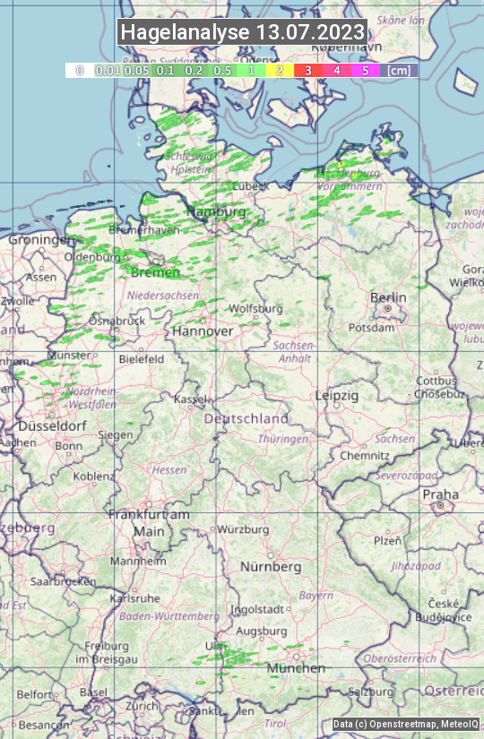 Die Hagelanalyse vom 13.07.2023 zeigt die Hagelspuren mit der maximalen Hagelkorngröße des Tages. Die Angabe erfolgt in Zentimeter.