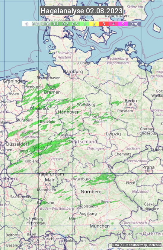 Die Hagelanalyse vom 02.08.2023 zeigt die Hagelspuren mit der maximalen Hagelkorngröße des Tages. Die Angabe erfolgt in Zentimeter.