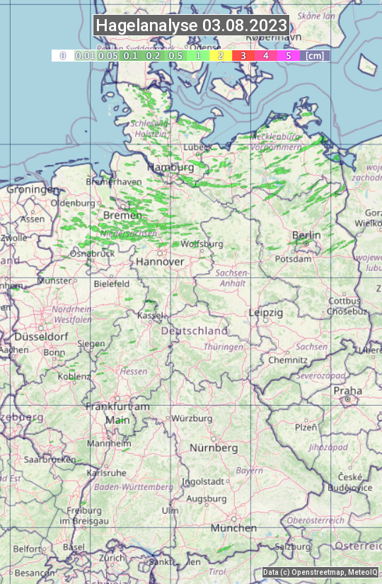Die Hagelanalyse vom 03.08.2023 zeigt die Hagelspuren mit der maximalen Hagelkorngröße des Tages. Die Angabe erfolgt in Zentimeter.