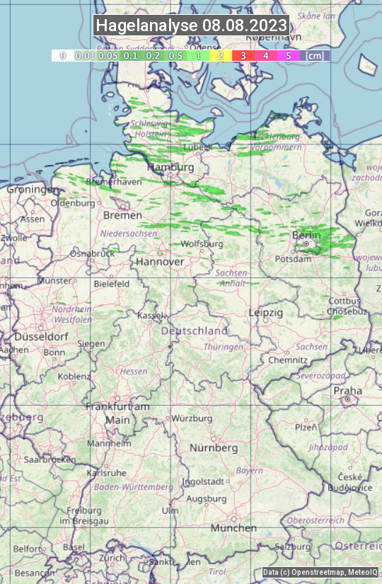 Die Hagelanalyse vom 08.08.2023 zeigt die Hagelspuren mit der maximalen Hagelkorngröße des Tages. Die Angabe erfolgt in Zentimeter.