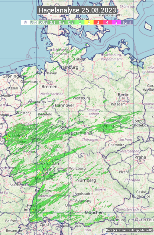 Die Hagelanalyse vom 25.08.2023 zeigt die Hagelspuren mit der maximalen Hagelkorngröße des Tages. Die Angabe erfolgt in Zentimeter.
