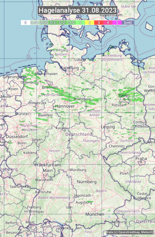 Die Hagelanalyse vom 31.08.2023 zeigt die Hagelspuren mit der maximalen Hagelkorngröße des Tages. Die Angabe erfolgt in Zentimeter.