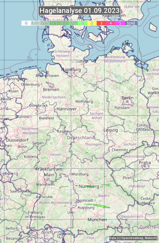 Die Hagelanalyse vom 01.09.2023 zeigt die Hagelspuren mit der maximalen Hagelkorngröße des Tages. Die Angabe erfolgt in Zentimeter.