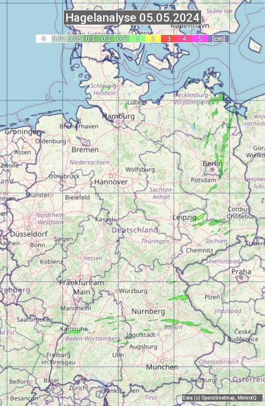 Die Hagelanalyse vom 05.05.2024 zeigt die Hagelspuren mit der maximalen Hagelkorngröße des Tages. Die Angabe erfolgt in Zentimeter.