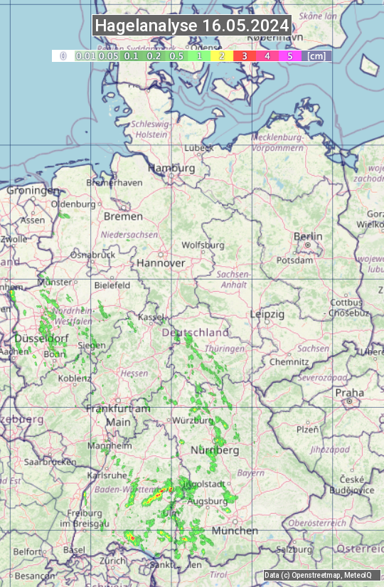 Die Hagelanalyse vom 16.05.2024 zeigt die Hagelspuren mit der maximalen Hagelkorngröße des Tages. Die Angabe erfolgt in Zentimeter.