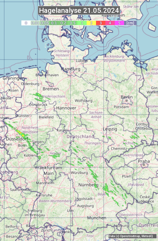 Die Hagelanalyse vom 21.05.2024 zeigt die Hagelspuren mit der maximalen Hagelkorngröße des Tages. Die Angabe erfolgt in Zentimeter.