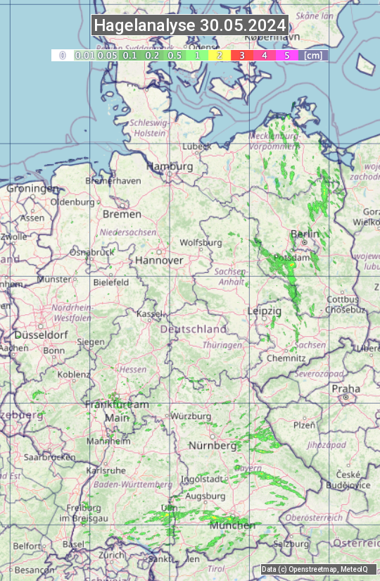 Die Hagelanalyse vom 30.05.2024 zeigt die Hagelspuren mit der maximalen Hagelkorngröße des Tages. Die Angabe erfolgt in Zentimeter.