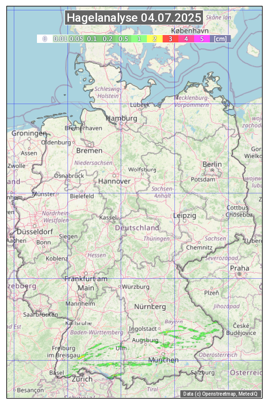 Die Hagelanalyse vom 04.07.2025 zeigt die Hagelspuren mit der maximalen Hagelkorngröße des Tages. Die Angabe erfolgt in Zentimeter.