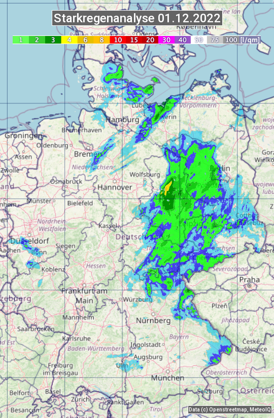 Die Starkregenanalyse zeigt die 24h-Niederschlagssumme am 01.12.2022. Sie basiert auf Radardaten vom Deutschen Wetterdienst in Kombination mit Wetterstationsbeobachtungen.