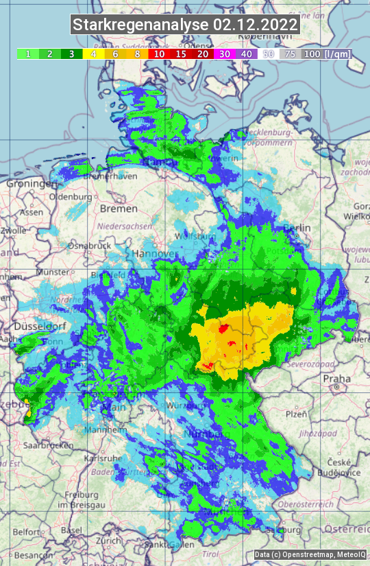 Die Starkregenanalyse zeigt die 24h-Niederschlagssumme am 02.12.2022. Sie basiert auf Radardaten vom Deutschen Wetterdienst in Kombination mit Wetterstationsbeobachtungen.