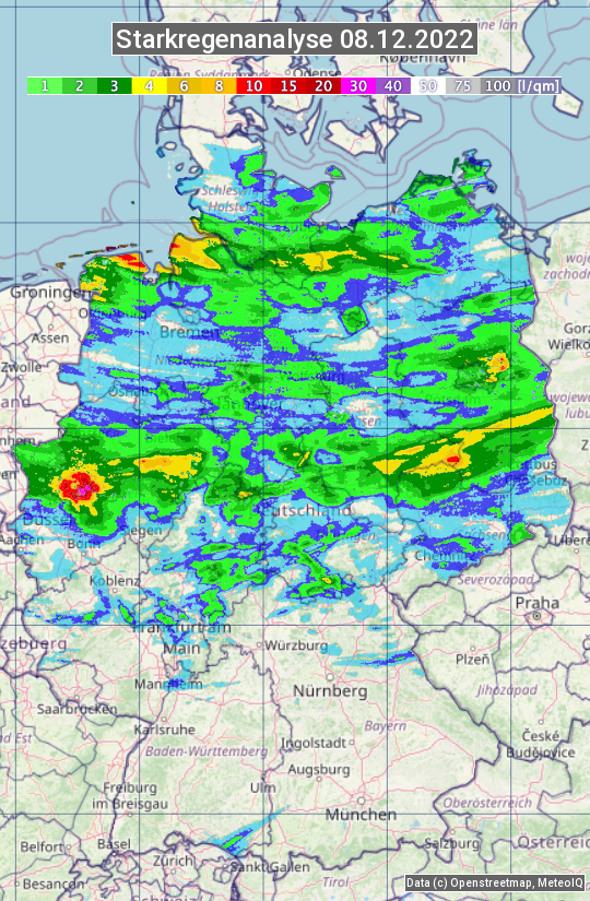 Die Starkregenanalyse zeigt die 24h-Niederschlagssumme am 08.12.2022. Sie basiert auf Radardaten vom Deutschen Wetterdienst in Kombination mit Wetterstationsbeobachtungen.