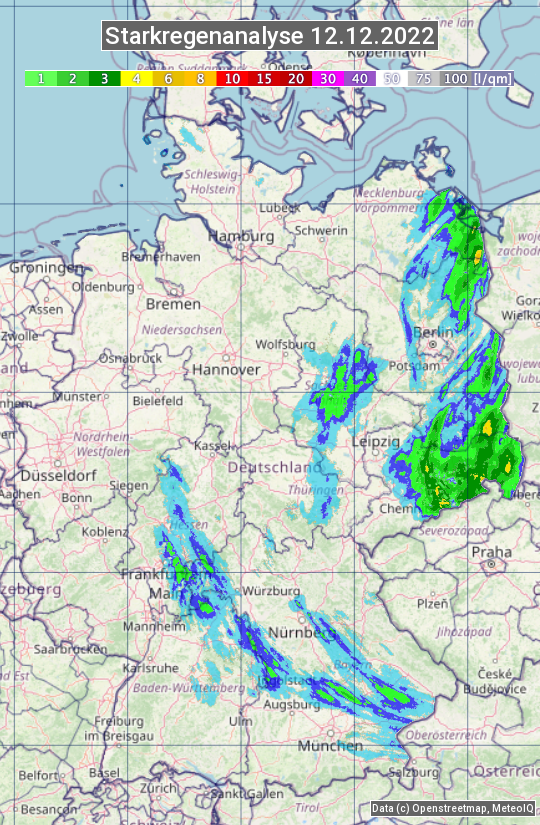 Die Starkregenanalyse zeigt die 24h-Niederschlagssumme am 12.12.2022. Sie basiert auf Radardaten vom Deutschen Wetterdienst in Kombination mit Wetterstationsbeobachtungen.