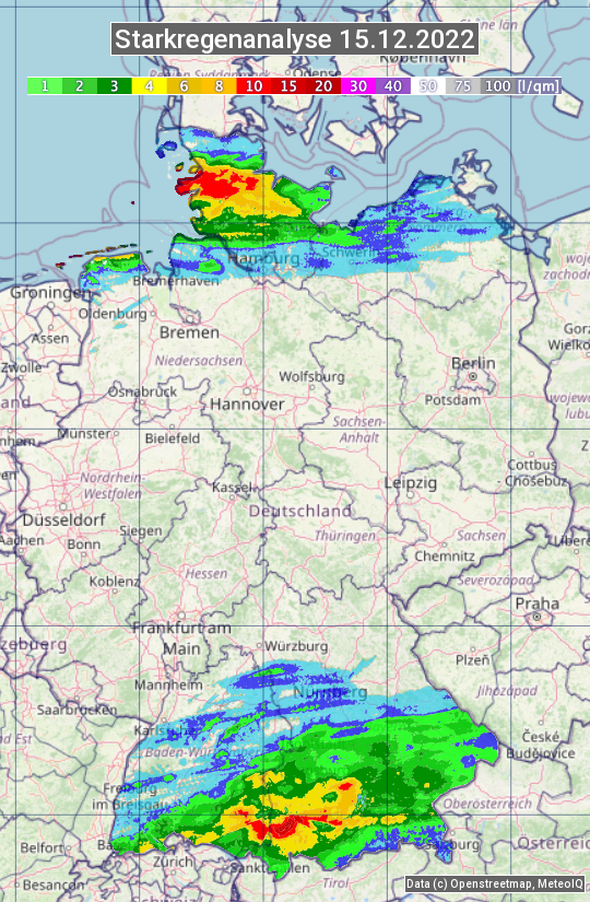 Die Starkregenanalyse zeigt die 24h-Niederschlagssumme am 15.12.2022. Sie basiert auf Radardaten vom Deutschen Wetterdienst in Kombination mit Wetterstationsbeobachtungen.