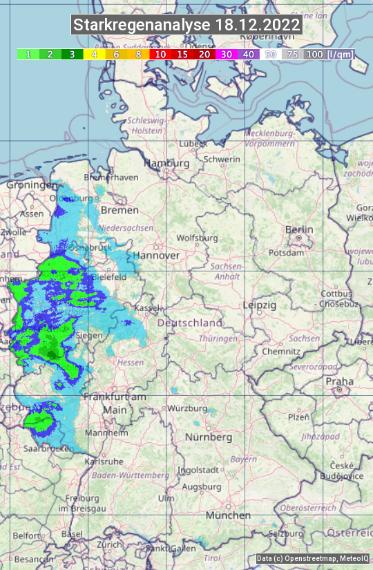Die Starkregenanalyse zeigt die 24h-Niederschlagssumme am 18.12.2022. Sie basiert auf Radardaten vom Deutschen Wetterdienst in Kombination mit Wetterstationsbeobachtungen.