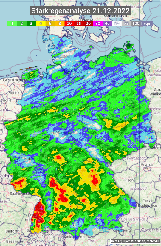 Die Starkregenanalyse zeigt die 24h-Niederschlagssumme am 21.12.2022. Sie basiert auf Radardaten vom Deutschen Wetterdienst in Kombination mit Wetterstationsbeobachtungen.