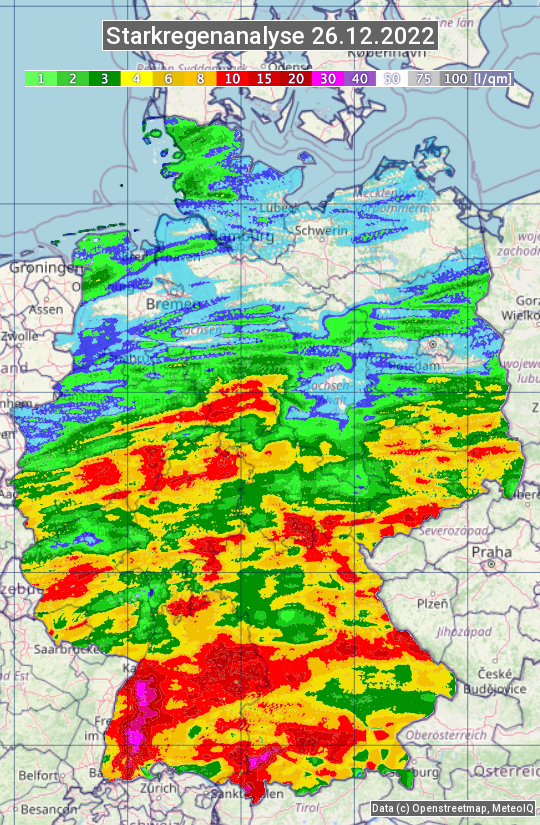 Die Starkregenanalyse zeigt die 24h-Niederschlagssumme am 26.12.2022. Sie basiert auf Radardaten vom Deutschen Wetterdienst in Kombination mit Wetterstationsbeobachtungen.