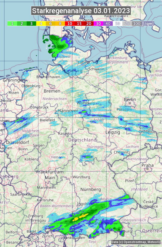 Die Starkregenanalyse zeigt die 24h-Niederschlagssumme am 03.01.2023. Sie basiert auf Radardaten vom Deutschen Wetterdienst in Kombination mit Wetterstationsbeobachtungen.