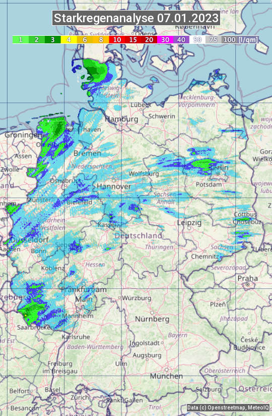 Die Starkregenanalyse zeigt die 24h-Niederschlagssumme am 07.01.2023. Sie basiert auf Radardaten vom Deutschen Wetterdienst in Kombination mit Wetterstationsbeobachtungen.