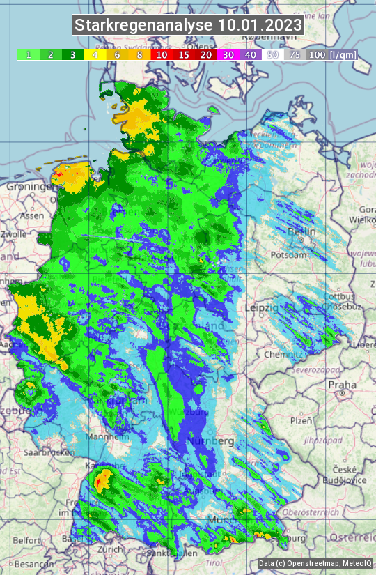 Die Starkregenanalyse zeigt die 24h-Niederschlagssumme am 10.01.2023. Sie basiert auf Radardaten vom Deutschen Wetterdienst in Kombination mit Wetterstationsbeobachtungen.