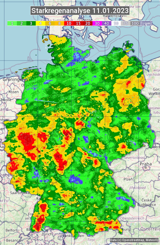Die Starkregenanalyse zeigt die 24h-Niederschlagssumme am 11.01.2023. Sie basiert auf Radardaten vom Deutschen Wetterdienst in Kombination mit Wetterstationsbeobachtungen.