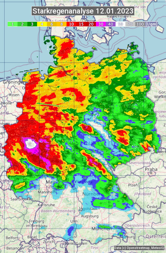 Die Starkregenanalyse zeigt die 24h-Niederschlagssumme am 12.01.2023. Sie basiert auf Radardaten vom Deutschen Wetterdienst in Kombination mit Wetterstationsbeobachtungen.
