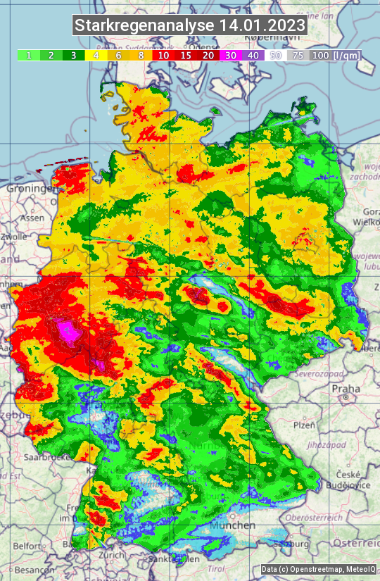 Die Starkregenanalyse zeigt die 24h-Niederschlagssumme am 14.01.2023. Sie basiert auf Radardaten vom Deutschen Wetterdienst in Kombination mit Wetterstationsbeobachtungen.