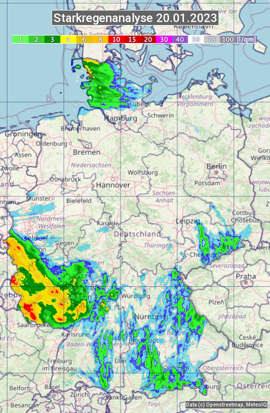Die Starkregenanalyse zeigt die 24h-Niederschlagssumme am 20.01.2023. Sie basiert auf Radardaten vom Deutschen Wetterdienst in Kombination mit Wetterstationsbeobachtungen.