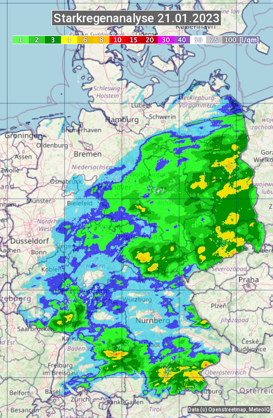 Die Starkregenanalyse zeigt die 24h-Niederschlagssumme am 21.01.2023. Sie basiert auf Radardaten vom Deutschen Wetterdienst in Kombination mit Wetterstationsbeobachtungen.