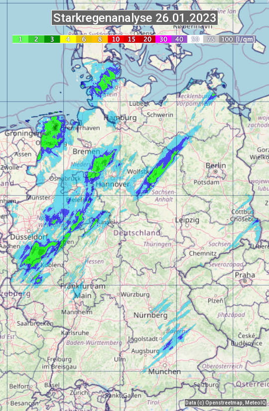 Die Starkregenanalyse zeigt die 24h-Niederschlagssumme am 26.01.2023. Sie basiert auf Radardaten vom Deutschen Wetterdienst in Kombination mit Wetterstationsbeobachtungen.