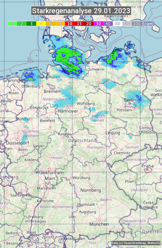 Die Starkregenanalyse zeigt die 24h-Niederschlagssumme am 29.01.2023. Sie basiert auf Radardaten vom Deutschen Wetterdienst in Kombination mit Wetterstationsbeobachtungen.