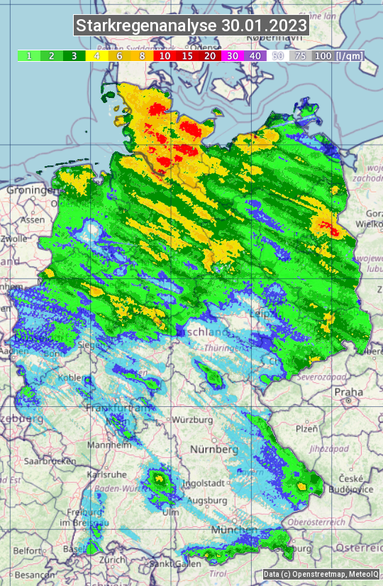Die Starkregenanalyse zeigt die 24h-Niederschlagssumme am 30.01.2023. Sie basiert auf Radardaten vom Deutschen Wetterdienst in Kombination mit Wetterstationsbeobachtungen.