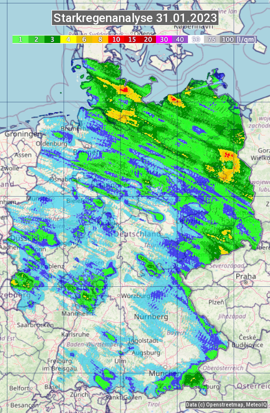 Die Starkregenanalyse zeigt die 24h-Niederschlagssumme am 31.01.2023. Sie basiert auf Radardaten vom Deutschen Wetterdienst in Kombination mit Wetterstationsbeobachtungen.