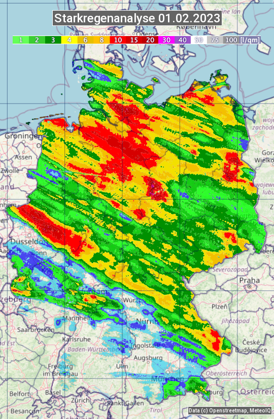Die Starkregenanalyse zeigt die 24h-Niederschlagssumme am 01.02.2023. Sie basiert auf Radardaten vom Deutschen Wetterdienst in Kombination mit Wetterstationsbeobachtungen.