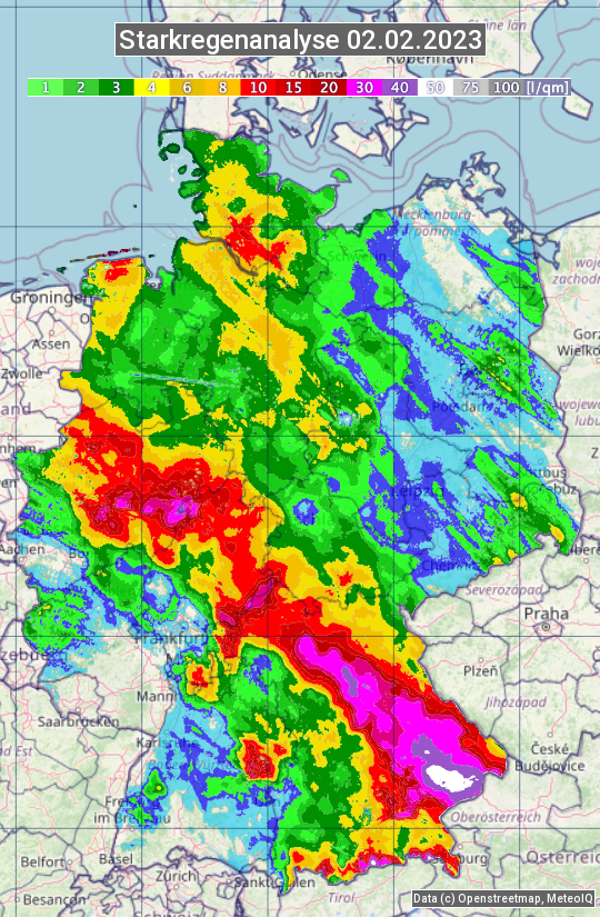 Die Starkregenanalyse zeigt die 24h-Niederschlagssumme am 02.02.2023. Sie basiert auf Radardaten vom Deutschen Wetterdienst in Kombination mit Wetterstationsbeobachtungen.