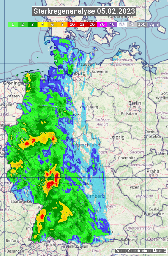 Die Starkregenanalyse zeigt die 24h-Niederschlagssumme am 05.02.2023. Sie basiert auf Radardaten vom Deutschen Wetterdienst in Kombination mit Wetterstationsbeobachtungen.