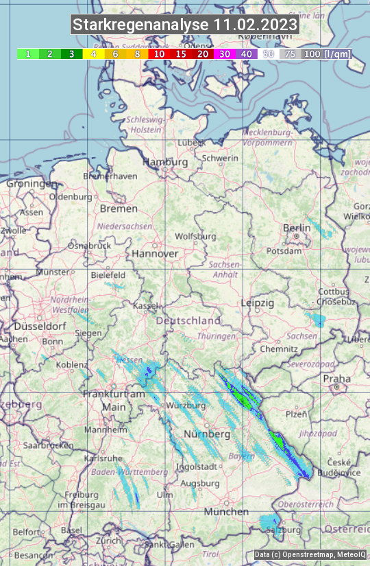 Die Starkregenanalyse zeigt die 24h-Niederschlagssumme am 11.02.2023. Sie basiert auf Radardaten vom Deutschen Wetterdienst in Kombination mit Wetterstationsbeobachtungen.