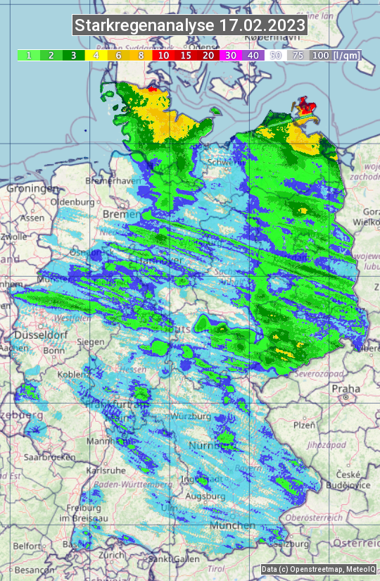 Die Starkregenanalyse zeigt die 24h-Niederschlagssumme am 17.02.2023. Sie basiert auf Radardaten vom Deutschen Wetterdienst in Kombination mit Wetterstationsbeobachtungen.