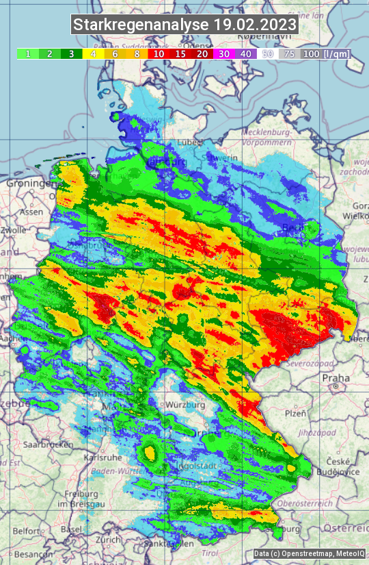 Die Starkregenanalyse zeigt die 24h-Niederschlagssumme am 19.02.2023. Sie basiert auf Radardaten vom Deutschen Wetterdienst in Kombination mit Wetterstationsbeobachtungen.