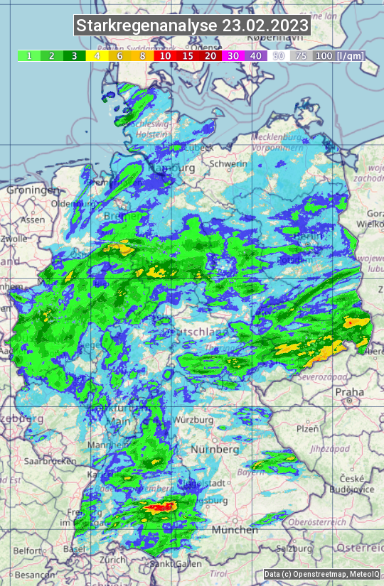 Die Starkregenanalyse zeigt die 24h-Niederschlagssumme am 23.02.2023. Sie basiert auf Radardaten vom Deutschen Wetterdienst in Kombination mit Wetterstationsbeobachtungen.