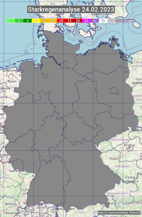 Die Starkregenanalyse zeigt die 24h-Niederschlagssumme am 24.02.2023. Sie basiert auf Radardaten vom Deutschen Wetterdienst in Kombination mit Wetterstationsbeobachtungen.