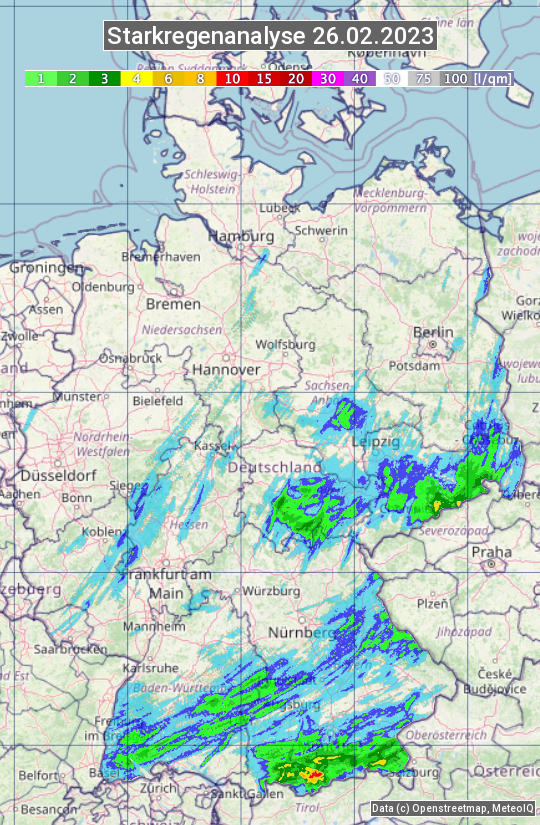 Die Starkregenanalyse zeigt die 24h-Niederschlagssumme am 26.02.2023. Sie basiert auf Radardaten vom Deutschen Wetterdienst in Kombination mit Wetterstationsbeobachtungen.