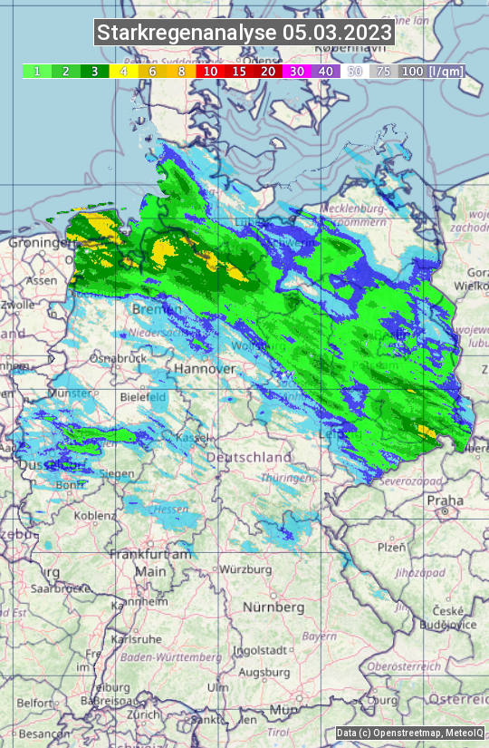 Die Starkregenanalyse zeigt die 24h-Niederschlagssumme am 05.03.2023. Sie basiert auf Radardaten vom Deutschen Wetterdienst in Kombination mit Wetterstationsbeobachtungen.
