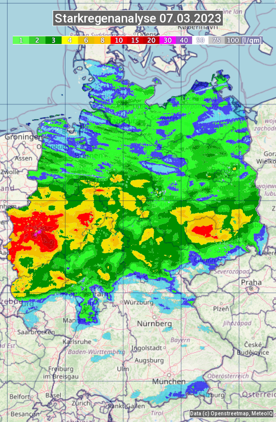 Die Starkregenanalyse zeigt die 24h-Niederschlagssumme am 07.03.2023. Sie basiert auf Radardaten vom Deutschen Wetterdienst in Kombination mit Wetterstationsbeobachtungen.