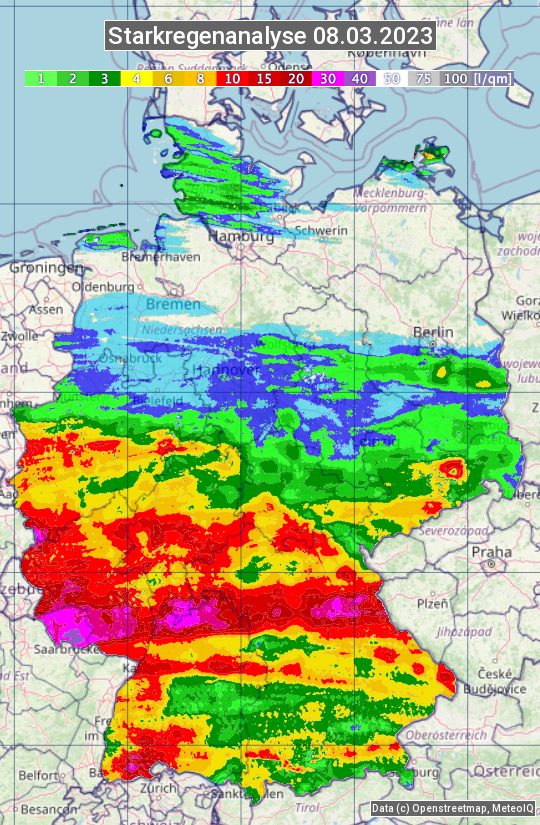 Die Starkregenanalyse zeigt die 24h-Niederschlagssumme am 08.03.2023. Sie basiert auf Radardaten vom Deutschen Wetterdienst in Kombination mit Wetterstationsbeobachtungen.
