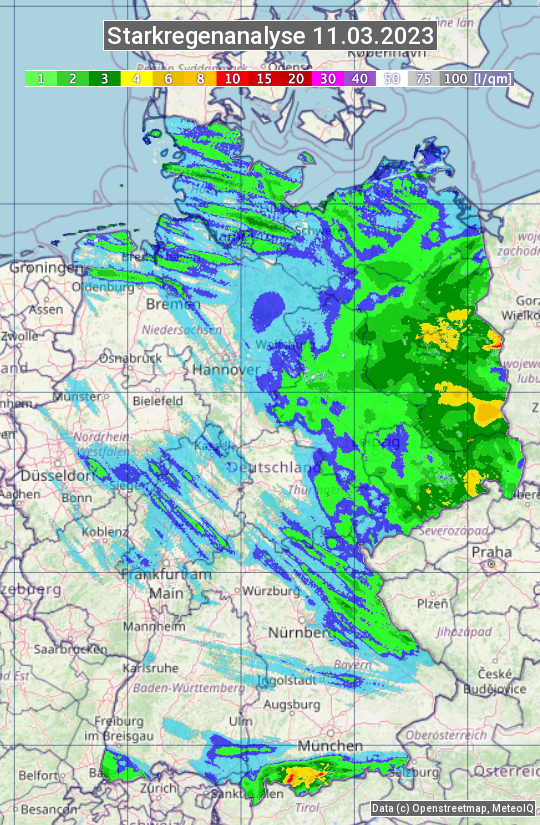 Die Starkregenanalyse zeigt die 24h-Niederschlagssumme am 11.03.2023. Sie basiert auf Radardaten vom Deutschen Wetterdienst in Kombination mit Wetterstationsbeobachtungen.