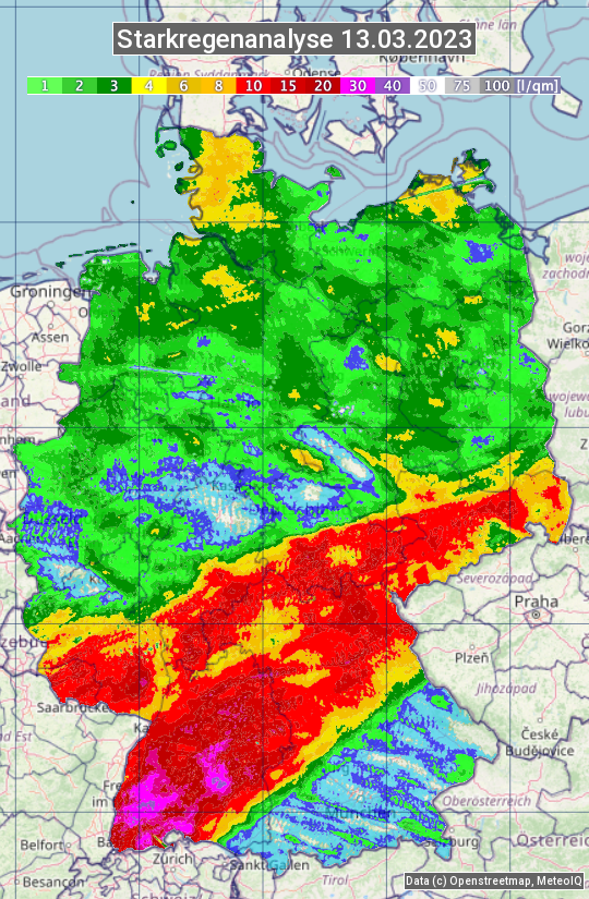 Die Starkregenanalyse zeigt die 24h-Niederschlagssumme am 13.03.2023. Sie basiert auf Radardaten vom Deutschen Wetterdienst in Kombination mit Wetterstationsbeobachtungen.