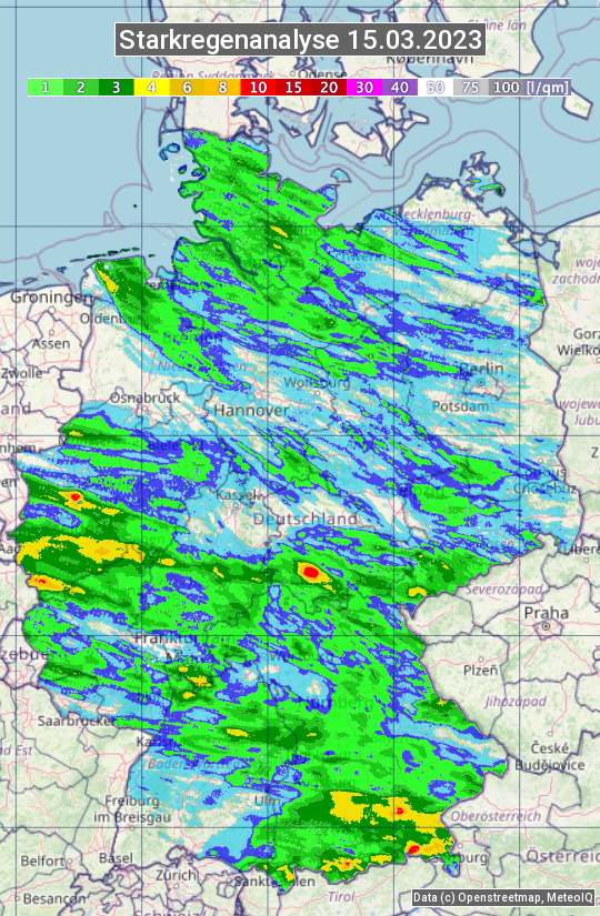 Die Starkregenanalyse zeigt die 24h-Niederschlagssumme am 15.03.2023. Sie basiert auf Radardaten vom Deutschen Wetterdienst in Kombination mit Wetterstationsbeobachtungen.