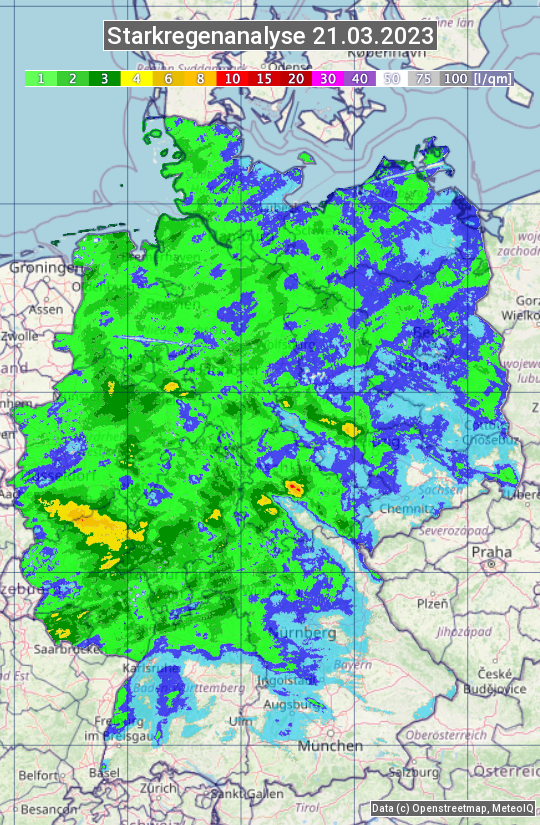 Die Starkregenanalyse zeigt die 24h-Niederschlagssumme am 21.03.2023. Sie basiert auf Radardaten vom Deutschen Wetterdienst in Kombination mit Wetterstationsbeobachtungen.